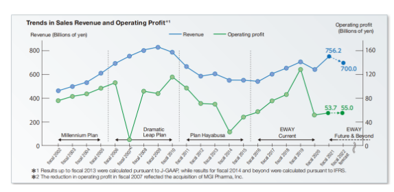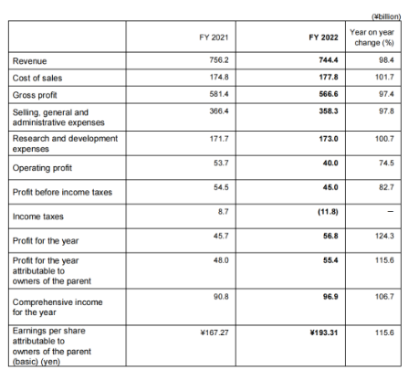 2022年收入7444亿日元(50.43亿美元,1.00美元=147.62日元),营业利润400亿日元(2.71亿美元)。虽然抗癌剂Lenvima(仑伐替尼)等全球品牌持续增长,但收入减少主要是由于默克公司的销售里程碑付款减少(本财政年度为167亿日元,上一财政年度为692亿日元),上一财年百时美施贵宝根据战略合作就抗体药物偶联物MORAB-202支付的预付款(496亿日元)虽然营业利润有所下降,但医药业务的分部利润大幅增长。