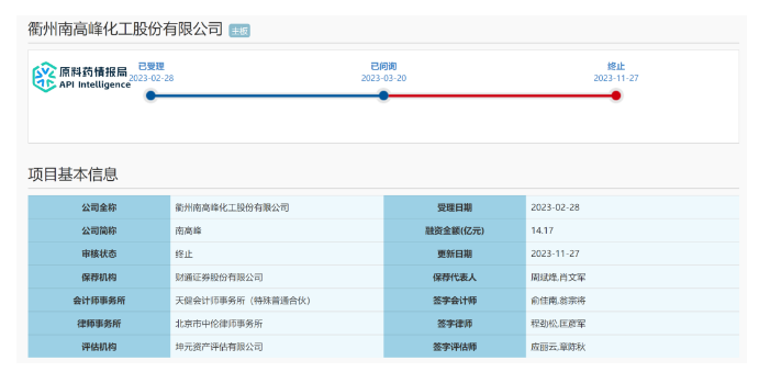 【原料药情报局】获悉:近日,根据上交所《关于终止对衢州南高峰化工股份有限公司首次公开发行股票并在沪市主板上市审核的决定》,终止了衢州南高峰主板IPO审核。