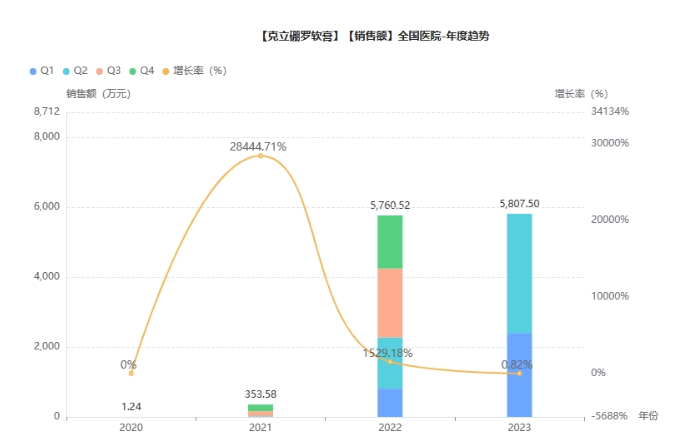 克立硼罗软膏由辉瑞公司的全资子公司Anacor Pharmaceuticals Inc.研发,它是10年来首个获批上市的AD处方药,也是首个抑制皮肤PDE-4的非甾体外用药物。于2016年12月14日首次获得FDA批准,商品名为Eucrisa®,适应症为治疗2岁及以上患者的轻度至中度AD。2019年,Eucrisa®销售额为1.38亿美元。据药融云数据统计,克立硼罗软膏从上市以来持续飙升,2022年在全国院内销售额突破千万,销售额达5761万元,同比增长达1529%,而2023年至今,销售额已远超2022年全年,销售额达5807万元。