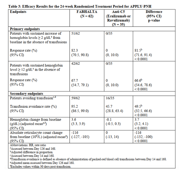 美国FDA的首次批准基于3期临床试验(APPLY-PNH)。该临床试验纳入血红蛋白<10 g/dL且此前接受过抗C5补体疗法治疗但仍有残余贫血的患者。结果显示,Fabhalta在提高血红蛋白水平和避免输血方面优于继续使用抗C5疗法治疗的患者。批准还依靠3期临床试验APPOINT-PNH的数据支持,该研究针对未接受过补体抑制剂治疗的患者。APPLY-PNH和APPOINT-PNH试验24周的主要发现包括: