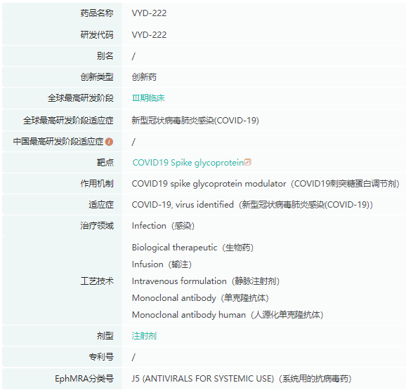 VYD222是一种具有广泛中和作用、半衰期延长的候选单克隆抗体 (mAb),目前正在开发用于预防免疫力低下者等易感人群的无症状 COVID-19 疫苗。目前,美国还没有授权或批准用于预防无症状 COVID-19 的单克隆抗体。