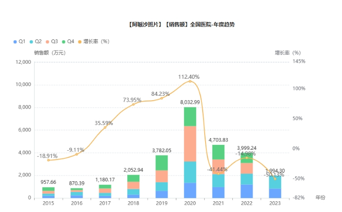 阿哌沙班片原研药(Eliquis®艾乐妥)由百时美施贵宝与辉瑞联合研发,是一种口服有效的、可逆的、高选择性的直接Xa因子抑制剂,适用于髋关节或膝关节择期置换术的成年患者,预防静脉血栓栓塞事件(VTE)。于2011和2012年在欧洲和美国上市,用于患者术后静脉血栓栓塞症(VTE)预防及房颤患者脑卒中预防。2013年 1 月在中国上市。阿哌沙班片在2020年则为141.17亿美元,2021年的销售额为167.32亿美元,2022年阿哌沙班全球销售额合计182.69亿美元。据药融云数据统计,阿哌沙班片在2020全国院内销售达到最高峰值,超8000万元,涨幅达112%。