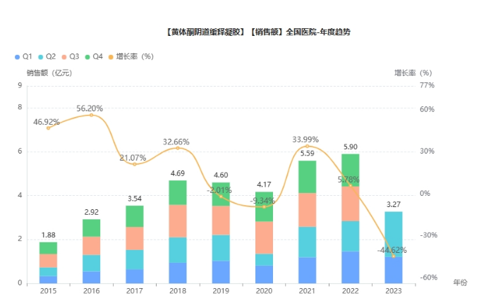 近年来,我国不孕不育症的患者基数和患病率均持续走高。根据弗若斯特沙利文数据,中国不孕不育夫妻的数量逐年增加,人数在2020年达到了5050万。发表在《柳叶刀》上的一篇报告分析结果显示,2007-2010年间,我国不孕发病率已经从11.9%升至15.5%,2020年的发病率将接近18%。据药融云数据统计,凝胶剂在2022年全国院内销售额近40亿元,同比增长达4.23%,其中黄体酮阴道缓释凝胶在2022年全国院内销售近6亿元,同比增长达5.78%。由此看来,作为辅助生殖的常用药,黄体酮阴道缓释凝胶前景明朗。