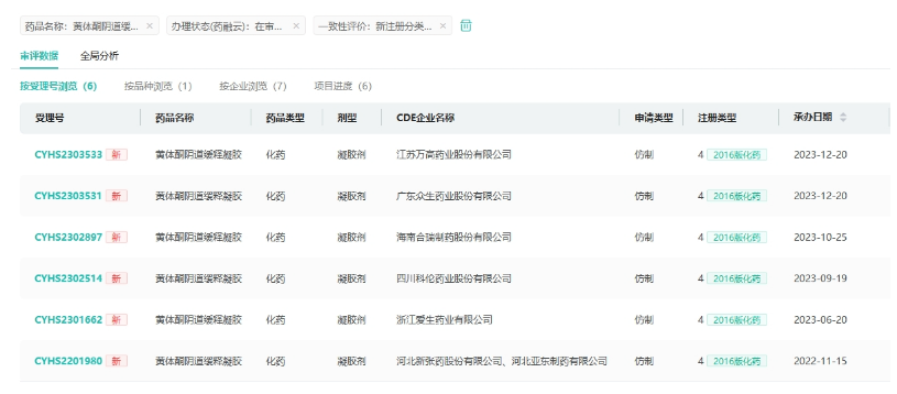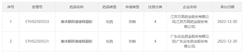 日前,据CDE官网最新公示,江苏万高药业和广东众生药业递交的4类仿制化药黄体酮阴道缓释凝胶上市申请获同日受理。目前,该品种由原研独家在售,尚无国产仿制药获批。