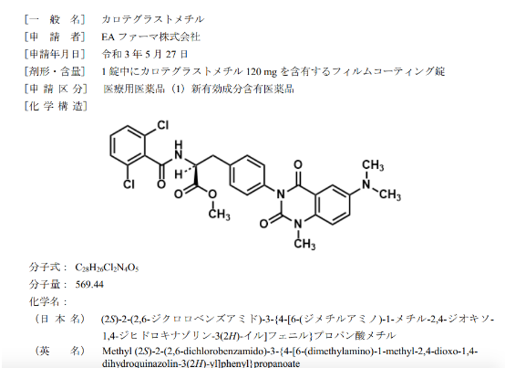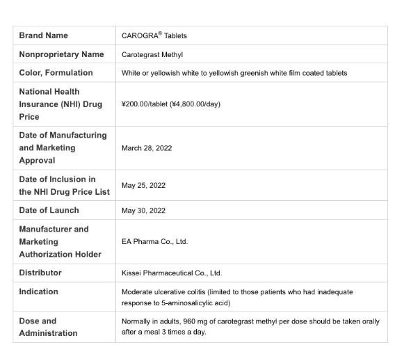 EA Pharma Co Ltd(EA制药株式会社)的Carotegrast methyl片于2022年3月28日获日本PMDA批准上市许可,商品名:カログラ/ CAROGRA,适用于中轻度溃疡性结肠炎(仅用于5-氨基水杨酸制剂治疗不充分时)(Ulcerative Colitis)。