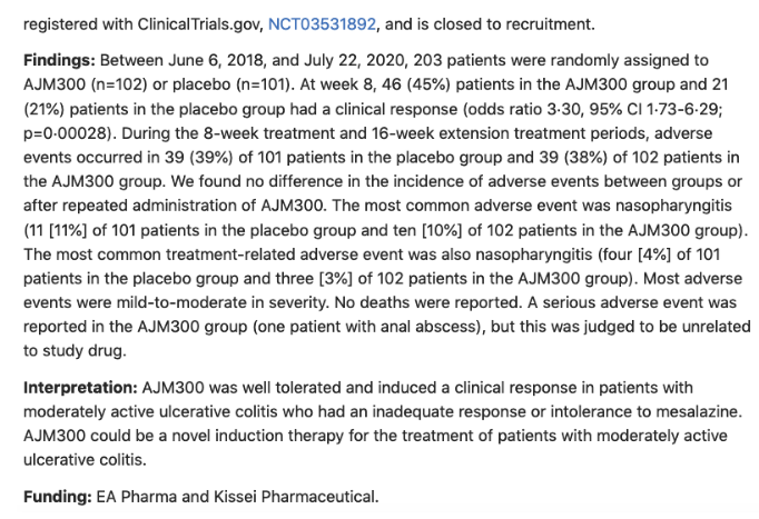 需要说明的是:EA制药株式会社由日本卫材集团胃肠道疾病业务与味之素集团胃肠道疾病业务共同成立于2016年4月,以氨基酸技术为核心,是一家具备研发、生产物流,及销售与商业化为一体的胃肠道专科制药企业。EA制药专注于推动炎症性肠病(IBD)及其他胃肠道疾病的药物发现与临床推动,为未满足临床需求提供解决方案。
