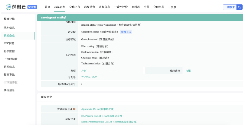 Carotegrast methyl原研为日本味之素集团旗下Ajinomoto Pharmaceuticals Co., Ltd.,本品是全球首个获批上市的口服α4整合素抑制剂,可作用于巨噬细胞等表面的α4β1和α4β7整合素,抑制其在结肠表面黏膜的过度聚集和侵入。相关专利:WO-00216329。此外本品开发的合作伙伴还包括Kissei Pharmaceutical Co Ltd.,目前也负责分销业务。