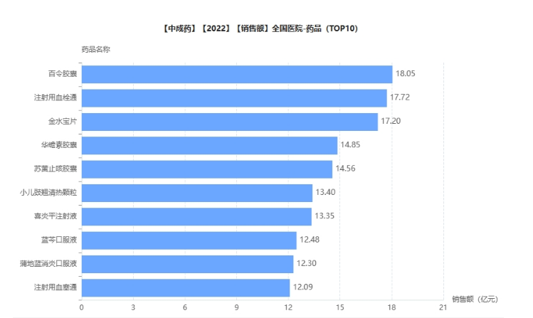 此外,在2022年中成药全国院内销售TOP20名单中,超过10亿的品种有19款,其中10款为独家品种,包括百令胶囊、注射用血栓通、喜炎平注射液、蓝芩口服液、脑心通胶囊、肾康注射液、复方丹参滴丸、尿毒清颗粒、生血宝合剂和注射用丹参多酚酸盐。