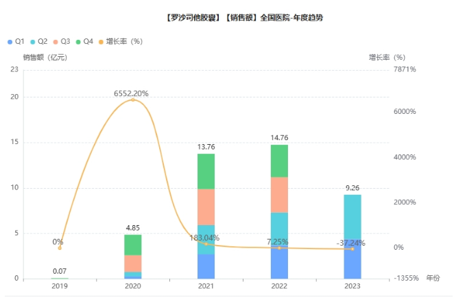 据药融云数据库,2019年底,罗沙司他成功通过价格谈判被纳入医保目录(乙类),此后市场空间迅速扩大。2021年,全国医院销售额突破10亿元大关,2022年继续增长,院内销售额已接近15亿元。据报道,罗沙司他成为中国CKD相关贫血市场份额排名第一的品牌。