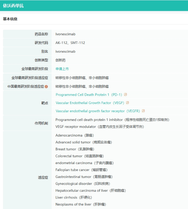 依沃西单抗(AK112)是康方生物研发的PD-1/VEGF双特异性抗体。基于该公司Tetrabody技术设计,依沃西单抗可阻断PD-1与PD-L1和PD-L2的结合,并同时阻断VEGF与VEGF受体的结合。