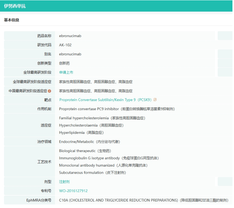 伊努西单抗(AK102)是康方生物与东瑞制药合资公司康融东方开发的创新PCSK9单克隆抗体,用于治疗原发型高胆固醇血症和混合型高脂血症,包括HoFH、HeFH及同时患有动脉粥样硬化性心血管疾病的高胆固醇血症患者。