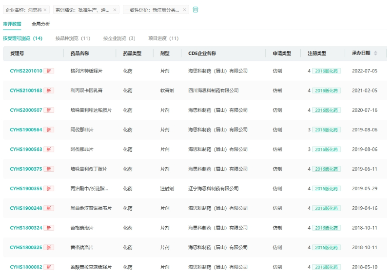 海思科积极布局药品研发领域,目前已经提交了地奈德乳膏、复方维生素注射液(3)、注射用水溶性维生素3款药的仿制上市申请。现有多款产品获批并视同通过一致性评价,除此次获批的格列齐特缓释片外,还有盐酸普拉克索缓释片、阿伐那非片、培哚普利吲达帕胺片等10款产品。其中复方利多卡因乳膏和格列齐特缓释片两个品种于今年获批。