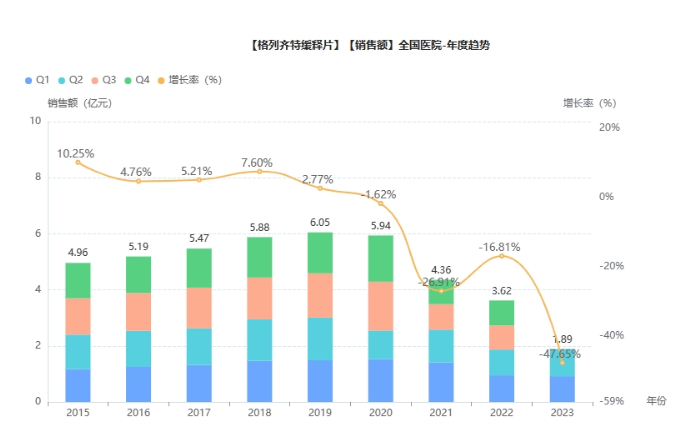这种并发症的发生与糖尿病病程、血糖控制等因素密切相关。DPN的主要症状包括手脚麻木、疼痛等,严重的情况下可能导致肢体溃烂,甚至不得不进行截肢手术,给患者带来巨大的身心伤害。目前,对于糖尿病周围神经病变的治疗主要依赖于药物,治疗药物市场具有巨大的潜力。据药融云数据统计,2022年糖尿病(化学药/生物药)用药全国院内销售额已达340亿。格列齐特缓释片在2022年全国院内销售额超3亿元。