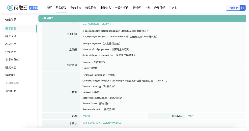 此次拟议收购将为阿斯利康公司不断扩充的细胞疗法管线增添GC012F CAR-T细胞疗法。作为基于FasTCAR技术平台打造的核心产品,GC012F是一款处于临床阶段的创新型BCMA/CD19双靶点自体嵌合抗原受体T(CAR-T)细胞疗法,有望成为针对多发性骨髓瘤、其他各类恶性血液肿瘤以及自身免疫性疾病(包括系统性红斑狼疮(SLE))的新一代治疗方案。药融云数据库监测显示:本品相关专利有WO-2020224605、WO-2020224606等。