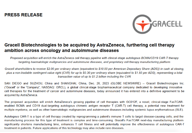 2023年12月26日,亘喜生物科技集团(纳斯达克股票代码:GRCL;简称“亘喜生物” 或“公司”) 宣布已与阿斯利康公司对其的收购提案达成最终协议。