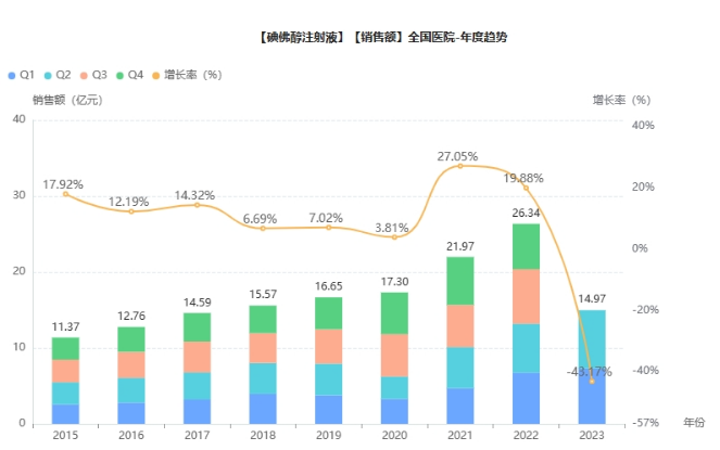 据药融云数据统计,碘佛醇注射液自上市以来,在全国院内销售市场规模持续增长。该产品2022年在全国院内销售额超26亿元,同比增长近20%。其中,恒瑞医药占据了91.93%的市场份额。