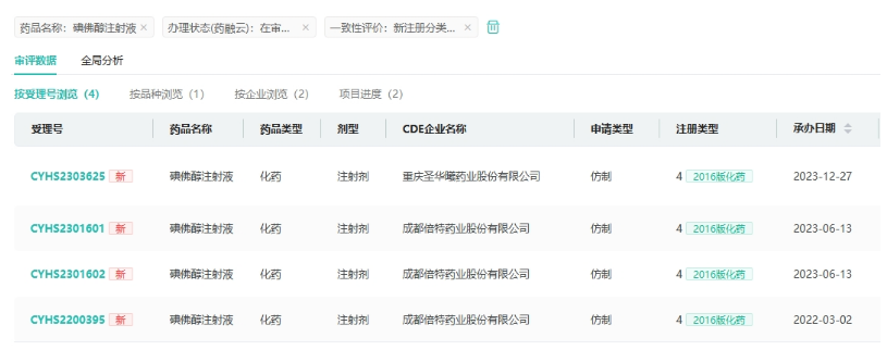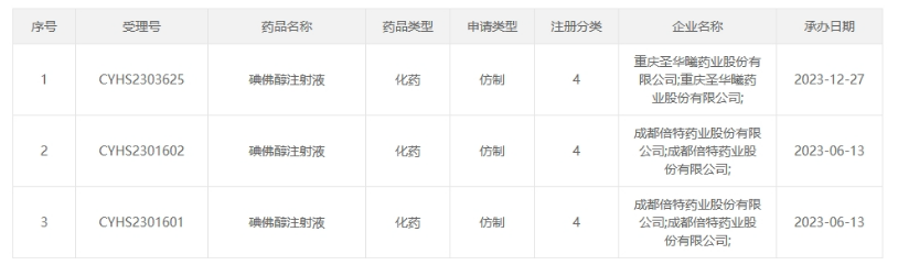 近日,据CDE官网显示,重庆圣华曦药业递交的4类仿制化药碘佛醇注射液上市申请获受理。今年6月份,倍特药业也提交了该品种的上市申请。据药融云数据统计,除原研,目前仅恒瑞医药和上海司太立制药2家国产企业拥有该品种的批文,若重庆圣华曦药业和倍特药业能顺利获批,有望斩获国产第3家。