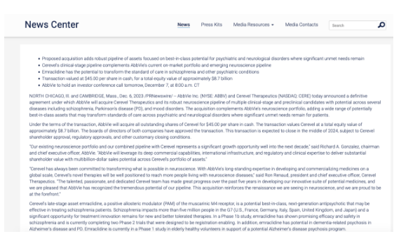 2023年12月7日,制药巨头艾伯维宣布一项最终协议,将以每股45美元的价格现金收购Cerevel Therapeutics及其强大的神经科学产品管线,总价值约87亿美元,预计将在2024 年完成收购。