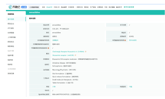 Emraclidine是一种M4选择性正变构调节剂(PAM),正在开发用于精神分裂症和阿尔茨海默病精神病。