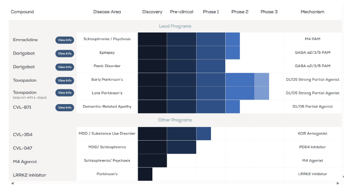 除了这些先导项目外,Cerevel Therapeutics还在推进其早期临床管线和发现项目,其中包括CVL-354,一种选择性κ阿片受体拮抗剂(KORA),用于治疗重度抑郁症和物质使用障碍;用于治疗精神和神经系统适应症的选择性M4激动剂方案;选择性PDE4抑制剂(PDE4D-sparing)计划,用于治疗精神,神经炎症和其他疾病。