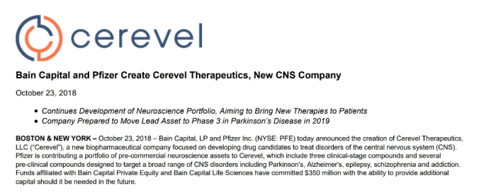 2018年10月辉瑞和贝恩资本合作推出了专注于开发治疗中枢神经系统疾病的疗法公司Cerevel Therapeutics辉瑞向其提供一系列处于不同临床研究阶段的化合物和若干临床前研发阶段的化合物,所涉及的疾病治疗领域包括帕金森病、阿尔茨海默病、癫痫、精神分裂症和成瘾性疾病。与此同时,辉瑞公司制定了一项为期五年的计划,投资6亿美元作为风险投资基金,其中高达1.5亿美元用于神经科学。
