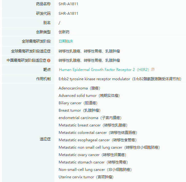 SHR-A1811是一款靶向HER2的ADC产品,此前用于HER2阳性晚期结直肠癌的适应症已经被中国国家药监局(NMPA)纳入突破性治疗品种。