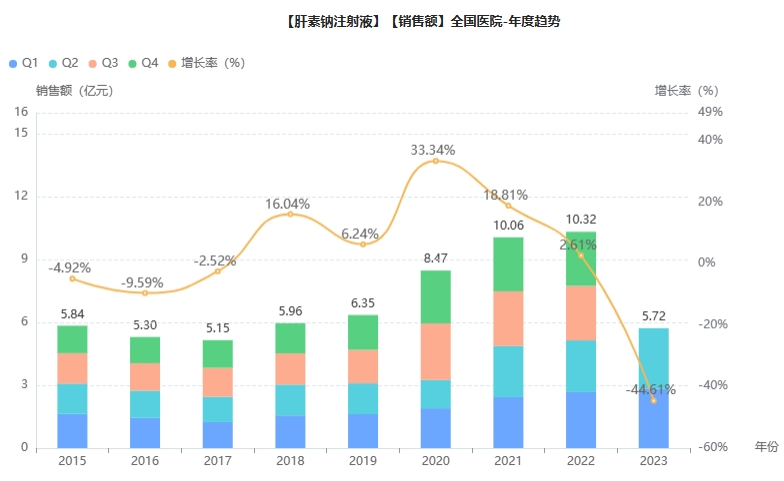 2022年,肝素钠注射液院内销售高达10.32亿元,位居抗血栓形成药注射剂TOP5产品。
