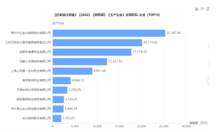 从市场竞争格局来看,常州千红生化制药股份有限公司、江苏万邦生化医药集团有限责任公司、成都市海通药业有限公司市场份额位居前三。