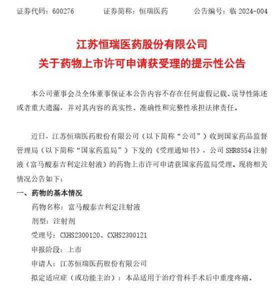 近日,据恒瑞医药公告,公司提交的SHR8554注射液(富马酸泰吉利定注射液)药物上市许可申请已获CDE受理,该品种拟定适应症为骨科手术后中重度疼痛。这是该新药申报的第二个适应症,首个适应症为腹部手术后中重度疼痛,已于2022年7月首次申报上市,目前仍在审评中。此次申请的受理标志着恒瑞医药在疼痛治疗领域的又一重要进展。
