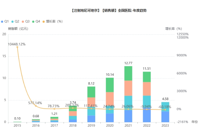 中国冠心病患者数量不断上升,随着病患对硝酸酯类等常用药出现低反应或耐药等现象,近年来尼可地尔临床用药稳定上涨。据药融云数据统计,注射用尼可地尔2022年在全国院内销售近12亿。