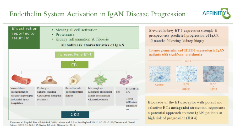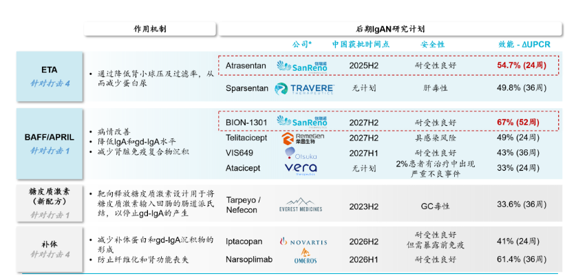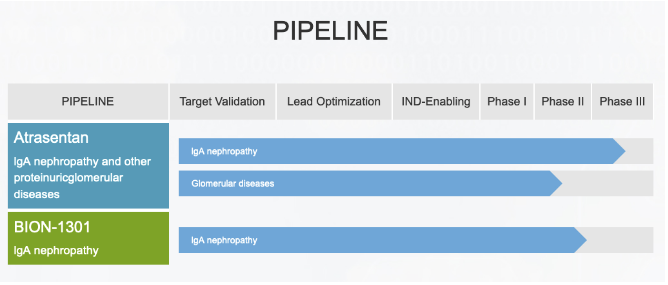 Atrasentan是一种强效高选择性(Ki=0.034nM)内皮素A(ETA)受体拮抗剂,可选择性阻断ETA受体,通过阻断肾小球系膜细胞活化,直接的抗炎和抗纤维化,降低球囊内压力和肾小球滤过屏障大分子的通透性来减少 IgAN 患者的尿蛋白。本品最早由雅培制药开发,相关专利WO-09606095;后转让予Chinook;现不同地区权益归属于诺华和信瑞诺。