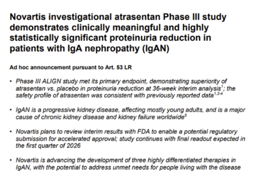 2023年10月30日,诺华/Chinook披露了atrasentan治疗IgA肾病的III期ALIGN临床研究36周期中分析取得了积极结果。