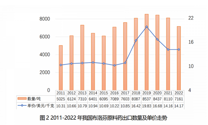 中国医药保健品进出口商会统计,2020-2022我国布洛芬原料出口分别为8437吨、8110吨、7161吨。