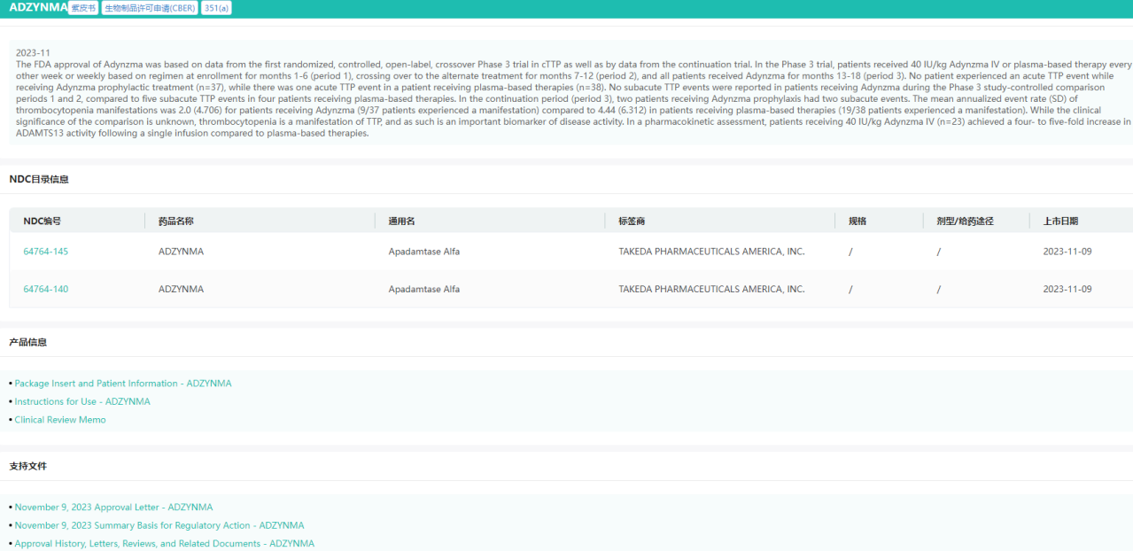 Adzynma(TAK-755)是一款ADAMTS13重组蛋白,可以替代缺失或功能失常的ADAMTS13酶,通过补充ADAMTS13酶功能,可以有效改善cTTP的急、慢性症状,以及其他由ADAMTS13缺陷引起的合并症,从而改善CTTP患者的生活质量和寿命,用于先天性血栓性血小板减少性紫癜(cTTP)成人和儿童患者的预防性或按需酶替代疗法(ERT)。
