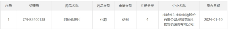 昨日,据CDE官网,成都苑东生物制药递交的4类仿制化药阿帕他胺片(受理号:CYHS2400138)上市申请获受理。目前苑东生物是第三家递交该品种上市申请的企业,目前国内暂无有仿制药获批。