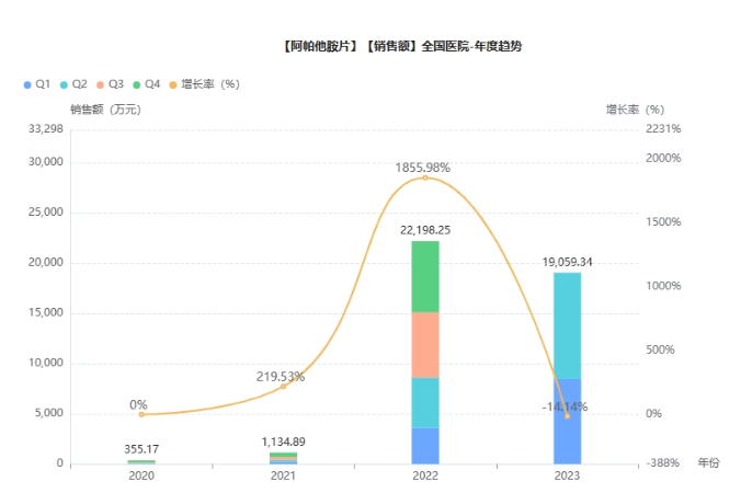 阿帕他胺2021年通过国家医保谈判顺利进入国家医保药物目录乙类。进入医保后,阿帕他胺进入高速放量阶段,2022年,阿帕他胺全球销售额18.81亿美元,同比增长45.7%,为“重磅前列腺药物”。据药融云数据统计,2022年,阿帕他胺院内销售超2亿元,同比增长达1856%。2023年上半年销售额近2亿,已接近2022年全年销售总额。