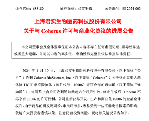 1月10日,君实生物发布公告称,收到Coherus关于终止重组人源化抗TIGIT单克隆抗体(项目代号:JS006)许可合作的通知函许可终止自公司收到通知函起六个月后生效。终止生效后,Coherus不再享有JS006的许可权利,公司重新获得开发、生产和商业化JS006的全部全球权利。