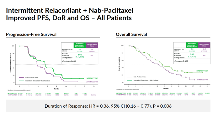 具体来说,间歇性接受高剂量Relacorilant(150 mg,nab-紫杉醇输注的前一天、当天和第二天)联合nab-紫杉醇治疗的患者PFS改善具有统计学意义(5.6个月vs 3.8个月,风险比:0.66,p值:0.038);每日接受低剂量(100 mg)Relacorilant治疗的患者比单独接受nab-紫杉醇治疗的患者显示出PFS延长1.5个月(5.3个月vs 3.8个月,风险比:0.83,p值:不显著)。与单独接受nab-紫杉醇治疗的患者相比,间歇性接受高剂量Relacorilant治疗的患者中位DoR更长(5.6个月vs 3.7个月),中位OS也更长(13.9个月vs 12.2个月)。2022年6月,Corcept启动了一项关键的3期试验(ROSELLA),该研究计划入组360名患有铂类耐药复发卵巢癌的女性,预计到2024年底前获得结果。