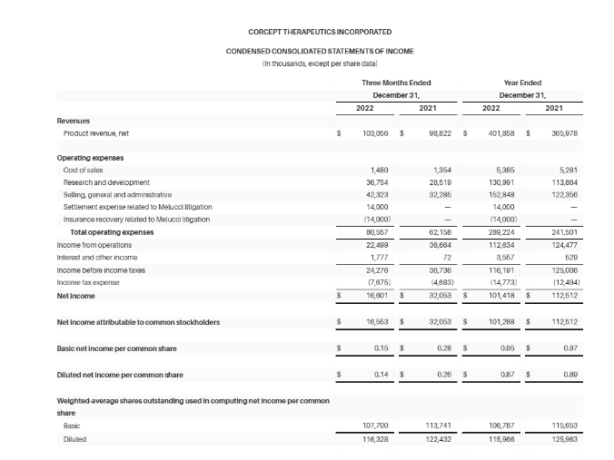 2022年度,Corcept公司产品净收入为4.019亿美元,同比增长9.8%;全年销售成本为539万美元,同比增长10.4%;研发开支为1.31亿美元,同比增长15%;销售、一般和行政费用为1.528亿美元,同比增长24.8%。