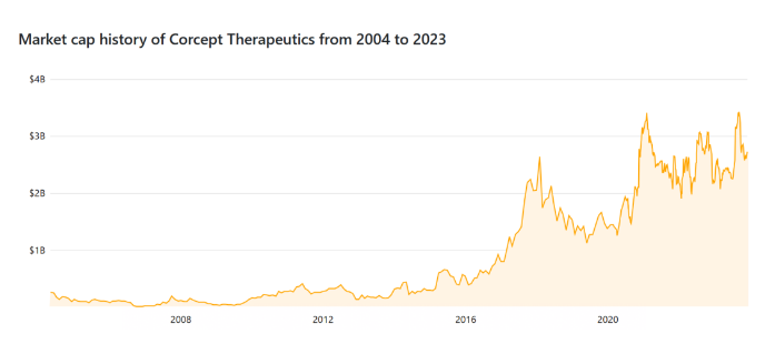 该公司在2004年登陆纳斯达克(NASDAQ:CORT),截至2023年12月初,市值约为27亿美元。截止2024年1月2日收盘,市值约24.9亿美元,约合178亿人民币。最新发布文章前市值为173亿。