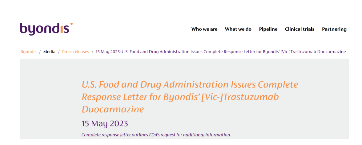 5月15日,Byondis公司宣布收到FDA的完整回复函(CRL)。FDA在CRL中表示,暂停对靶向HER2的ADC药物SYD985生物制品许可申请(BLA)的批准,需要更多的信息来支持审批决定,这些信息也需要额外的时间来审查。Byondis方对FDA的决定感到遗憾,但是也表示将继续推进SYD985在欧盟和英国的上市。