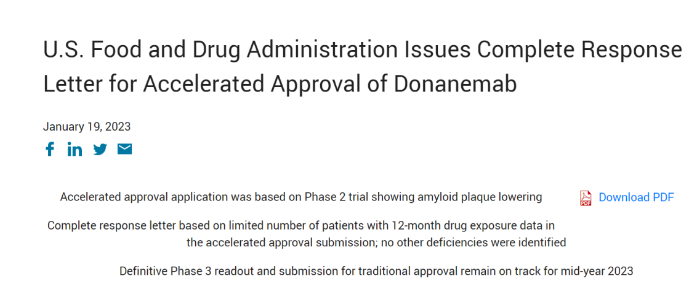 2023年1月19日,礼来发布公告表示公司已经收到FDA关于其阿尔茨海默病新药donanemab加速批准申请的完整回复函。FDA没有批准的原因是NDA申请所基于的临床试验中接受至少12个月药物治疗的患者数量有限。FDA特别要求礼来提供至少100名接受donanemab至少12个月持续治疗的患者的数据。FDA在完整回复函中未提及其它缺陷。
