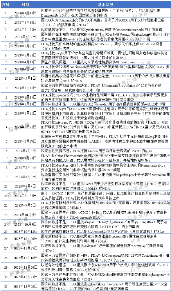 据不完全统计,过去的2023年里有31款新药被FDA拒批,涉及到肿瘤、心脏疾病、呼吸系统疾病和皮肤病等等,被拒理由绝大多数集中于对产品有效性和安全性的质疑上,包括临床获益存疑、临床数据单一等问题。除临床问题外,CMC(化学、制造和控制)问题也开始成为FDA拒绝批准的另一项重要因素。在此文中小编整理了2023年FDA拒批新药,或许能为业内理解FDA的审评标准提供帮助。