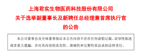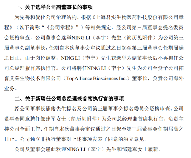 1月12日盘后,君实生物(688180)发布高管人员任职变动公告:公司董事会选举举NING LI(李宁)先生(简历见附件)为副董事长。此外,由于岗位调整,获任后的李宁不再担任公司总经理兼CEO,公司将聘任李宁为公司全资子公司拓普艾莱生物技术有限公司(TopAlliance Biosciences Inc.)董事长,负责公司海外业务。