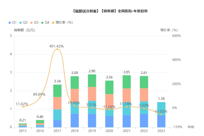 短缺药品挂网的价格差异巨大,可能与长期未供货、价格没有更新有关,网上查询挂网价为2.5元的硫酸镁注射液,并没有医院实际采购。据药融云数据统计,硫酸镁注射液在2022年全国院内销售为2.81亿元。