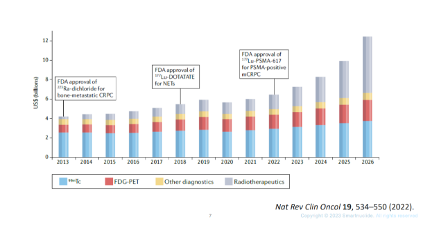 应用于人体内的核素药物可分为诊断用核药和治疗用核药。2022年,Nat Rev Clin Onco发表关于整个放射性药物市场份额的预测,可以看到目前市场分布还是以诊断药物为主,未来大体量的一定是放射性治疗药物。