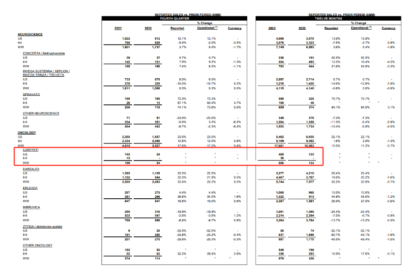 2024年1月23日,强生发布了2023年全年业绩:2023财年全年销售额达到852亿美元,同比增长6.5%,主要由Darzalex、Stelara、Erleada、Carvykti等创新药物强劲销售驱动的;研发费用150.85亿美元,同比增长6.7%;其中2023 Q4销售额214亿美元,同比增长7.3%。