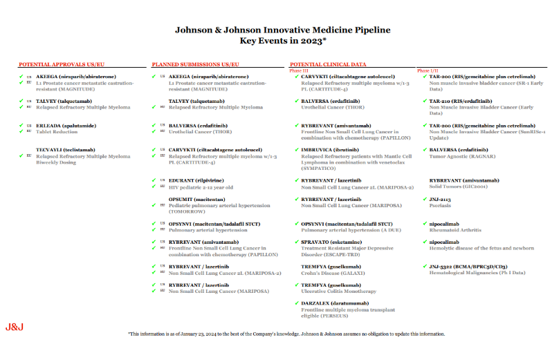 2023年强生多款新药实现新进展:例如在研TAR-200获得美国FDA突破性疗法认定,用于治疗高风险非肌肉浸润性膀胱癌;向欧洲药品管理局提交 RYBREVANT(amivantamab)联合化疗治疗既往治疗失败后患有晚期 EGFR 突变非小细胞肺癌成年患者的申请等等。