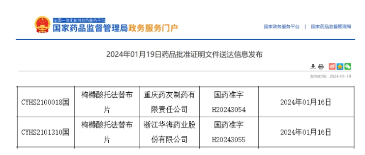 除此次获批的枸橼酸托法替布片,2023年至今,重庆药友制药已有13个品种获批生产并视同过评,涵盖抗肿瘤和免疫调节剂、消化系统及代谢药、神经系统药物、全身用抗感染药物等治疗领域。浙江华海药业已有15款品种获批生产并视同过评,涵盖生殖泌尿系统和性激素类药物、神经系统用药、心血管系统用药、抗肿瘤药和免疫机能调节药等治疗领域。