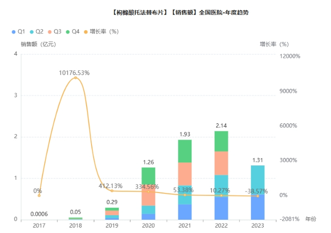 托法替布(Tofacitinib)是辉瑞公司开发的一种 JAK1/JAK3 的口服小分子抑制剂,阻断多种炎性细胞因子的信号转导。托法替布最早于 2012 年 11 月获 FDA 批准用于治疗中度到重度的类风湿性关节炎(RA),成为全球首个被批准治疗类风湿性关节炎的 JAK 抑制剂。据药融云数据统计,枸橼酸托法替布片自上市以来,在全国院内销售持续稳定增长,2022年全国院内销售超2亿元,同比增长达10.27% 。